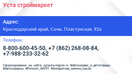 Уста, строймаркет по адресу Краснодарский край, Сочи, Пластунская, 92а в дальнейшем Организация, размещена в следующих категориях: