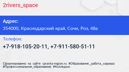 2rivers_space по адресу 354000, Краснодарский край, Сочи, Роз, 48а в дальнейшем Организация, размещена в следующих категориях: