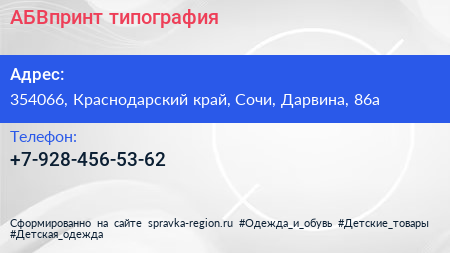 АБВпринт, типография по адресу 354066, Краснодарский край, Сочи, Дарвина, 86а в дальнейшем Организация, размещена в следующих категориях: