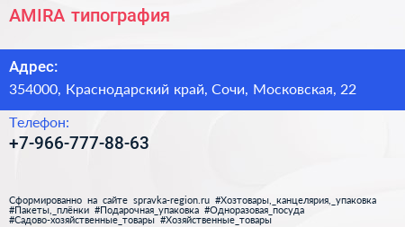 AMIRA, типография по адресу 354000, Краснодарский край, Сочи, Московская, 22 в дальнейшем Организация, размещена в следующих категориях: