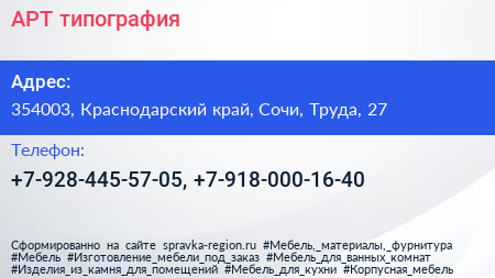 АРТ, типография по адресу 354003, Краснодарский край, Сочи, Труда, 27 в дальнейшем Организация, размещена в следующих категориях:
