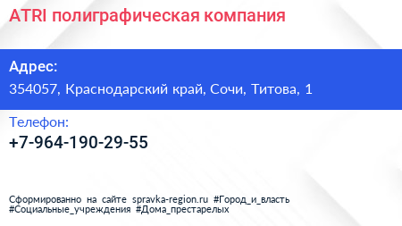 ATRI, полиграфическая компания по адресу 354057, Краснодарский край, Сочи, Титова, 1 в дальнейшем Организация, размещена в следующих категориях: