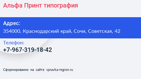 Альфа Принт, типография по адресу 354000, Краснодарский край, Сочи, Советская, 42 в дальнейшем Организация, размещена в следующих категориях: