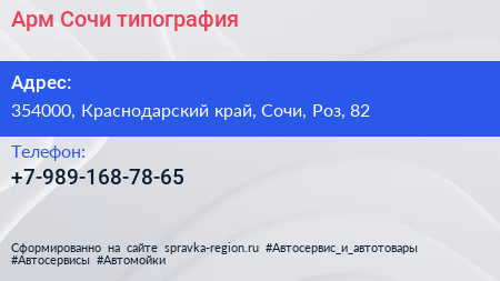 Арм Сочи, типография по адресу 354000, Краснодарский край, Сочи, Роз, 82 в дальнейшем Организация, размещена в следующих категориях: