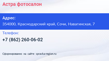 Астра, фотосалон по адресу 354000, Краснодарский край, Сочи, Навагинская, 7 в дальнейшем Организация, размещена в следующих категориях: