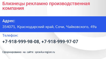 Близнецы, рекламно-производственная компания по адресу 354071, Краснодарский край, Сочи, Чайковского, 49а в дальнейшем Организация, размещена в следующих категориях: