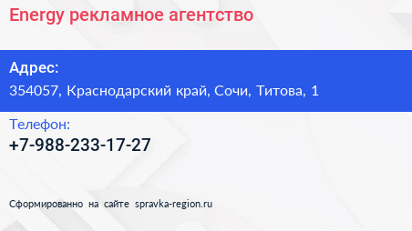 Energy, рекламное агентство по адресу 354057, Краснодарский край, Сочи, Титова, 1 в дальнейшем Организация, размещена в следующих категориях: