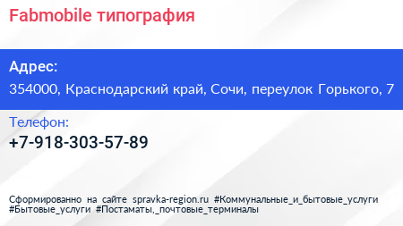 Fabmobile, типография по адресу 354000, Краснодарский край, Сочи, переулок Горького, 7 в дальнейшем Организация, размещена в следующих категориях: