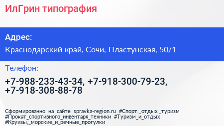 ИлГрин, типография по адресу Краснодарский край, Сочи, Пластунская, 50/1 в дальнейшем Организация, размещена в следующих категориях: