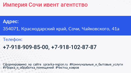 Империя-Сочи, ивент-агентство по адресу 354071, Краснодарский край, Сочи, Чайковского, 41а в дальнейшем Организация, размещена в следующих категориях: