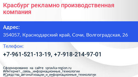Красбург, рекламно-производственная компания по адресу 354057, Краснодарский край, Сочи, Волгоградская, 26 в дальнейшем Организация, размещена в следующих категориях:
