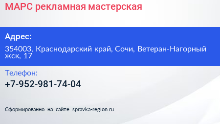 МАРС, рекламная мастерская по адресу 354003, Краснодарский край, Сочи, Ветеран-Нагорный жск, 17 в дальнейшем Организация, размещена в следующих категориях: