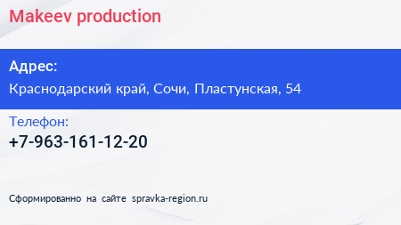 Makeev production по адресу Краснодарский край, Сочи, Пластунская, 54 в дальнейшем Организация, размещена в следующих категориях: