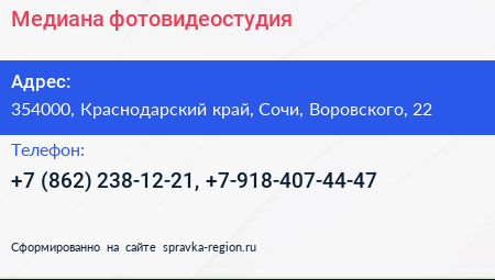 Медиана, фотовидеостудия по адресу 354000, Краснодарский край, Сочи, Воровского, 22 в дальнейшем Организация, размещена в следующих категориях: