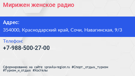 Мирижен, женское радио по адресу 354000, Краснодарский край, Сочи, Навагинская, 9/3 в дальнейшем Организация, размещена в следующих категориях: