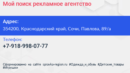 Мой поиск, рекламное агентство по адресу 354200, Краснодарский край, Сочи, Павлова, 89/а в дальнейшем Организация, размещена в следующих категориях: