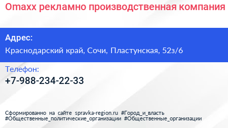Omaxx, рекламно-производственная компания по адресу Краснодарский край, Сочи, Пластунская, 52з/6 в дальнейшем Организация, размещена в следующих категориях:
