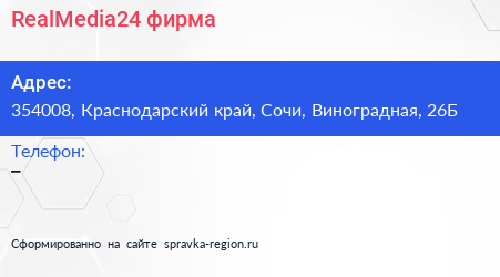 RealMedia24, фирма по адресу 354008, Краснодарский край, Сочи, Виноградная, 26Б в дальнейшем Организация, размещена в следующих категориях: