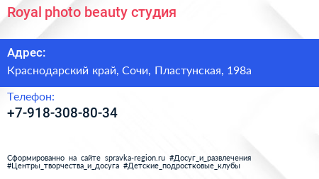 Royal photo & beauty, студия по адресу Краснодарский край, Сочи, Пластунская, 198а в дальнейшем Организация, размещена в следующих категориях: