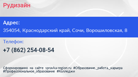 Рудизайн по адресу 354054, Краснодарский край, Сочи, Ворошиловская, 8 в дальнейшем Организация, размещена в следующих категориях: