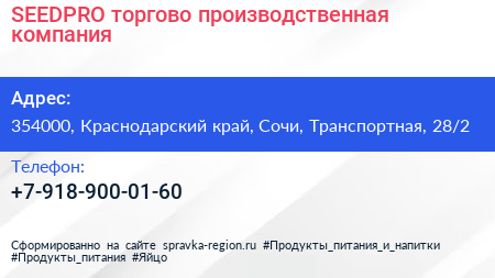 SEEDPRO, торгово-производственная компания по адресу 354000, Краснодарский край, Сочи, Транспортная, 28/2 в дальнейшем Организация, размещена в следующих категориях: