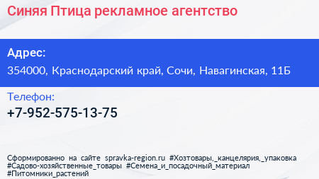 Синяя Птица, рекламное агентство по адресу 354000, Краснодарский край, Сочи, Навагинская, 11Б в дальнейшем Организация, размещена в следующих категориях: