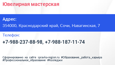 Ювелирная мастерская по адресу 354000, Краснодарский край, Сочи, Навагинская, 7 в дальнейшем Организация, размещена в следующих категориях: