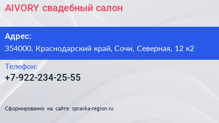 AIVORY, свадебный салон по адресу 354000, Краснодарский край, Сочи, Северная, 12 к2 в дальнейшем Организация, размещена в следующих категориях:
