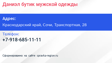Даниэл, бутик мужской одежды по адресу Краснодарский край, Сочи, Транспортная, 28 в дальнейшем Организация, размещена в следующих категориях: