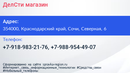 ДелСти, магазин по адресу 354000, Краснодарский край, Сочи, Северная, 6 в дальнейшем Организация, размещена в следующих категориях: