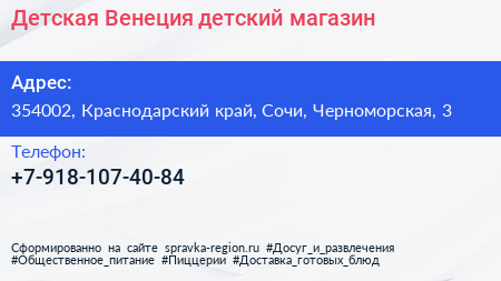 Детская Венеция, детский магазин по адресу 354002, Краснодарский край, Сочи, Черноморская, 3 в дальнейшем Организация, размещена в следующих категориях: