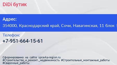 DiDi, бутик по адресу 354000, Краснодарский край, Сочи, Навагинская, 11 блок 5 в дальнейшем Организация, размещена в следующих категориях: