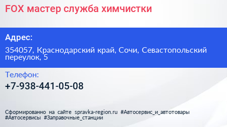 FOX-мастер, служба химчистки по адресу 354057, Краснодарский край, Сочи, Севастопольский переулок, 5 в дальнейшем Организация, размещена в следующих категориях:
