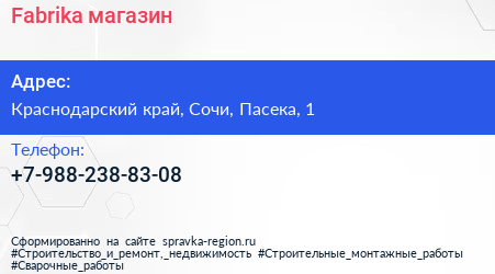 Fabrika, магазин по адресу Краснодарский край, Сочи, Пасека, 1 в дальнейшем Организация, размещена в следующих категориях: