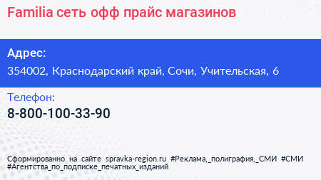 Familia, сеть офф-прайс магазинов по адресу 354002, Краснодарский край, Сочи, Учительская, 6 в дальнейшем Организация, размещена в следующих категориях: