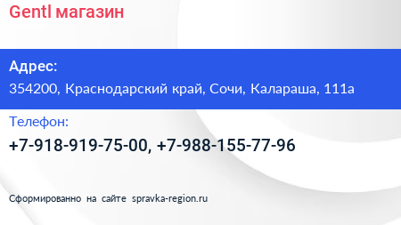 Gentl, магазин по адресу 354200, Краснодарский край, Сочи, Калараша, 111а в дальнейшем Организация, размещена в следующих категориях: