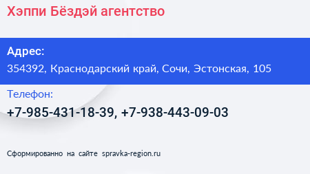 Хэппи Бёздэй, агентство по адресу 354392, Краснодарский край, Сочи, Эстонская, 105 в дальнейшем Организация, размещена в следующих категориях: