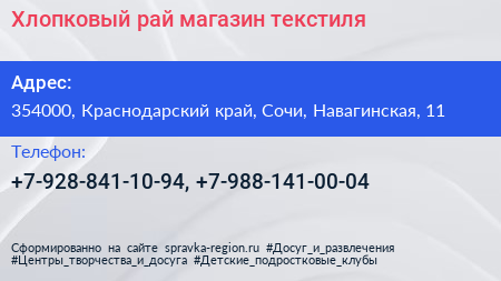 Хлопковый рай, магазин текстиля по адресу 354000, Краснодарский край, Сочи, Навагинская, 11 в дальнейшем Организация, размещена в следующих категориях: