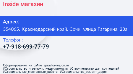 Inside, магазин по адресу 354065, Краснодарский край, Сочи, улица Гагарина, 23а в дальнейшем Организация, размещена в следующих категориях: