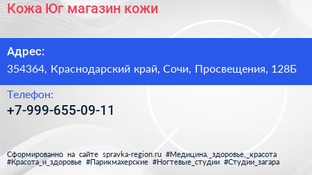 Кожа Юг, магазин кожи по адресу 354364, Краснодарский край, Сочи, Просвещения, 128Б в дальнейшем Организация, размещена в следующих категориях: