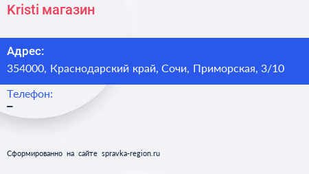 Kristi, магазин по адресу 354000, Краснодарский край, Сочи, Приморская, 3/10 в дальнейшем Организация, размещена в следующих категориях: