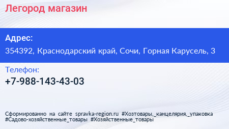 Легород, магазин по адресу 354392, Краснодарский край, Сочи, Горная Карусель, 3 в дальнейшем Организация, размещена в следующих категориях: