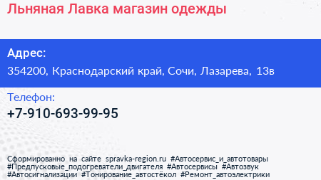Льняная Лавка, магазин одежды по адресу 354200, Краснодарский край, Сочи, Лазарева, 13в в дальнейшем Организация, размещена в следующих категориях:
