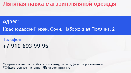 Льняная лавка, магазин льняной одежды по адресу Краснодарский край, Сочи, Набережная Полянка, 2 в дальнейшем Организация, размещена в следующих категориях: