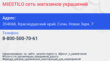 MIESTILO, сеть магазинов украшений по адресу 354068, Краснодарский край, Сочи, Новая Заря, 7 в дальнейшем Организация, размещена в следующих категориях: