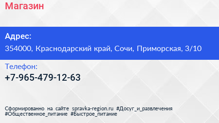 Магазин по адресу 354000, Краснодарский край, Сочи, Приморская, 3/10 в дальнейшем Организация, размещена в следующих категориях: