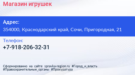 Магазин игрушек по адресу 354000, Краснодарский край, Сочи, Пригородная, 21 в дальнейшем Организация, размещена в следующих категориях: