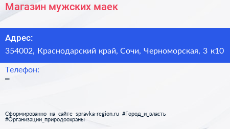 Магазин мужских маек по адресу 354002, Краснодарский край, Сочи, Черноморская, 3 к10 в дальнейшем Организация, размещена в следующих категориях: