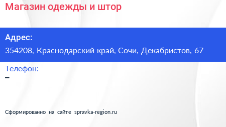 Магазин одежды и штор по адресу 354208, Краснодарский край, Сочи, Декабристов, 67 в дальнейшем Организация, размещена в следующих категориях: