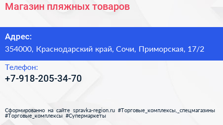 Магазин пляжных товаров по адресу 354000, Краснодарский край, Сочи, Приморская, 17/2 в дальнейшем Организация, размещена в следующих категориях: